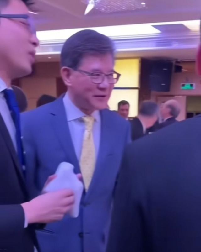78岁的罗康瑞西装笔挺,由于染了头发,整个人显得很是精神,完全看不出已经是一个年近80岁的老人了。一旁的霍启山手里拿着白酒杯正和罗康瑞侃侃而谈,“父子俩”同框画面非常温馨。